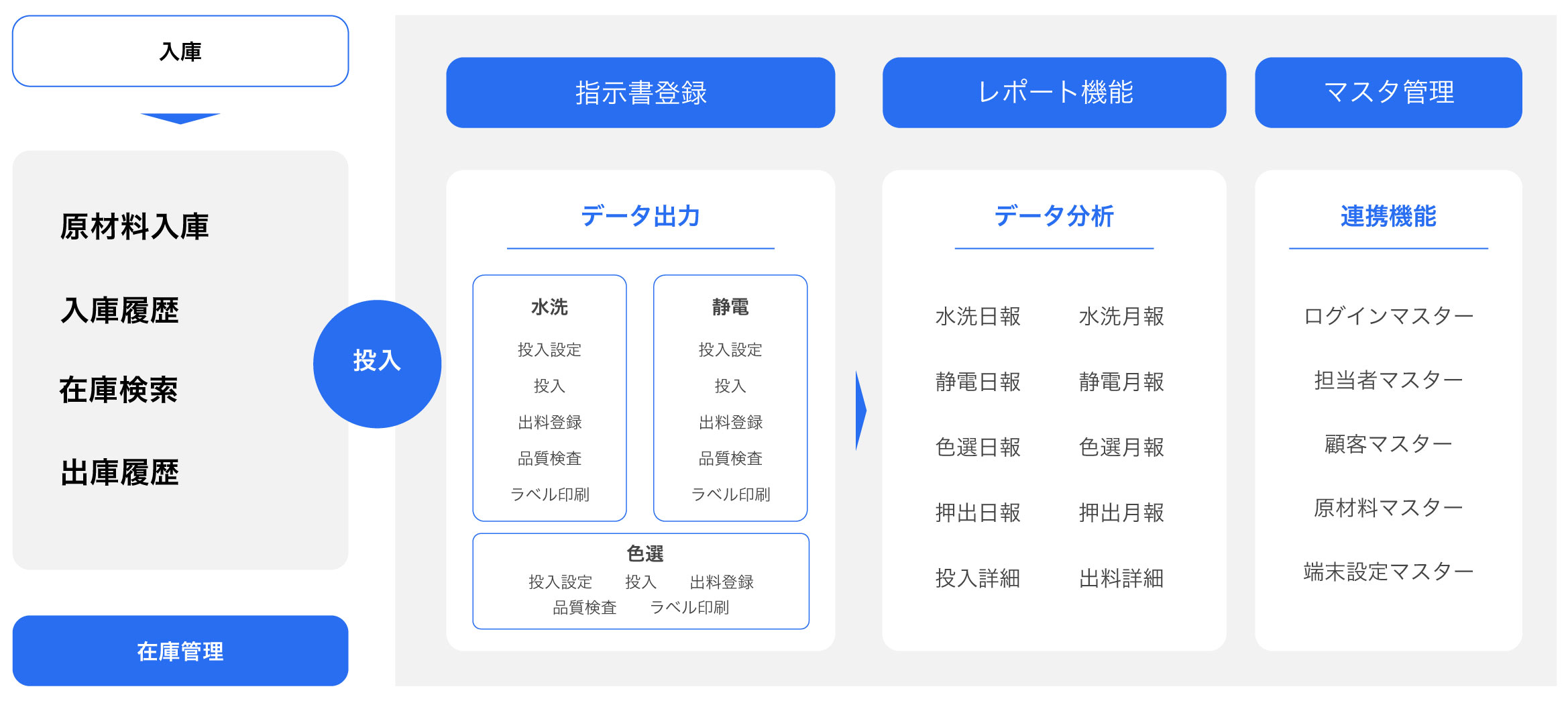 従来の手動で行われるリサイクル生産線の管理及び日報、月報、生産指示書の人工記録、手入力、手動統計をWEBシステム化に替えることで、ものの流れとデータの流れを統括的に管理することにより、効率的かつ精度の高い生産管理を実現し、生産管理の課題解決に特化したシステムです。
